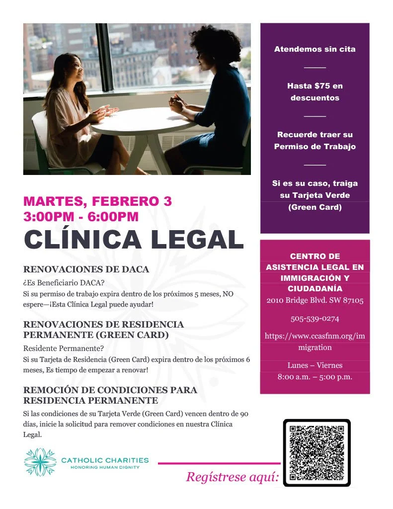 Catholic Charities in Albuquerque will be hosting a Legal Clinic to assist community members in need of legal immigration support. Please refer to the information below for more details: