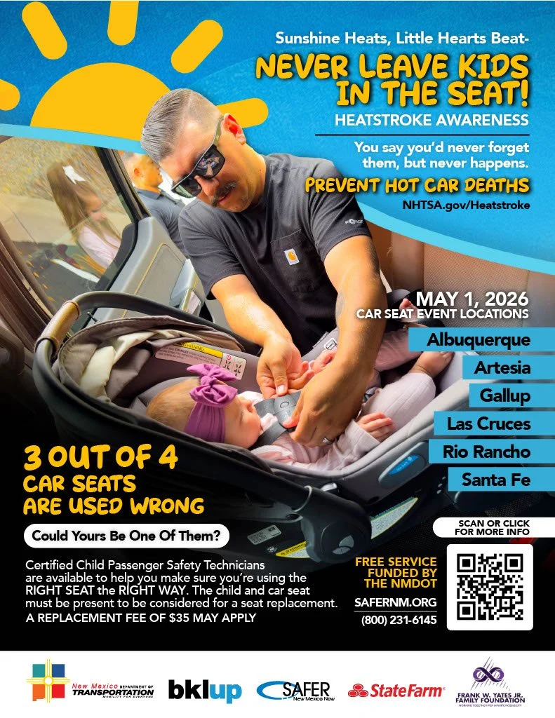 Drive-Thru Event happening at the Santa Fe Public Health Office on Friday May 1st in partnership with NM DOT. May 1st: Child Passenger Safety/Car Seat Clinic at 605 Letrado St. in Santa Fe. 9AM to 11AM If you are interested and do not reside in Santa Fe, please call 800-231-6145 for additional information.